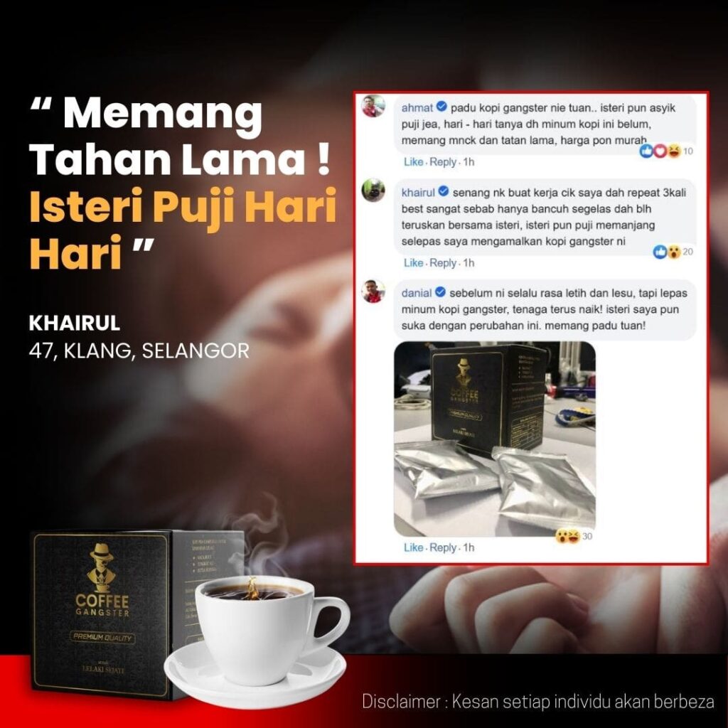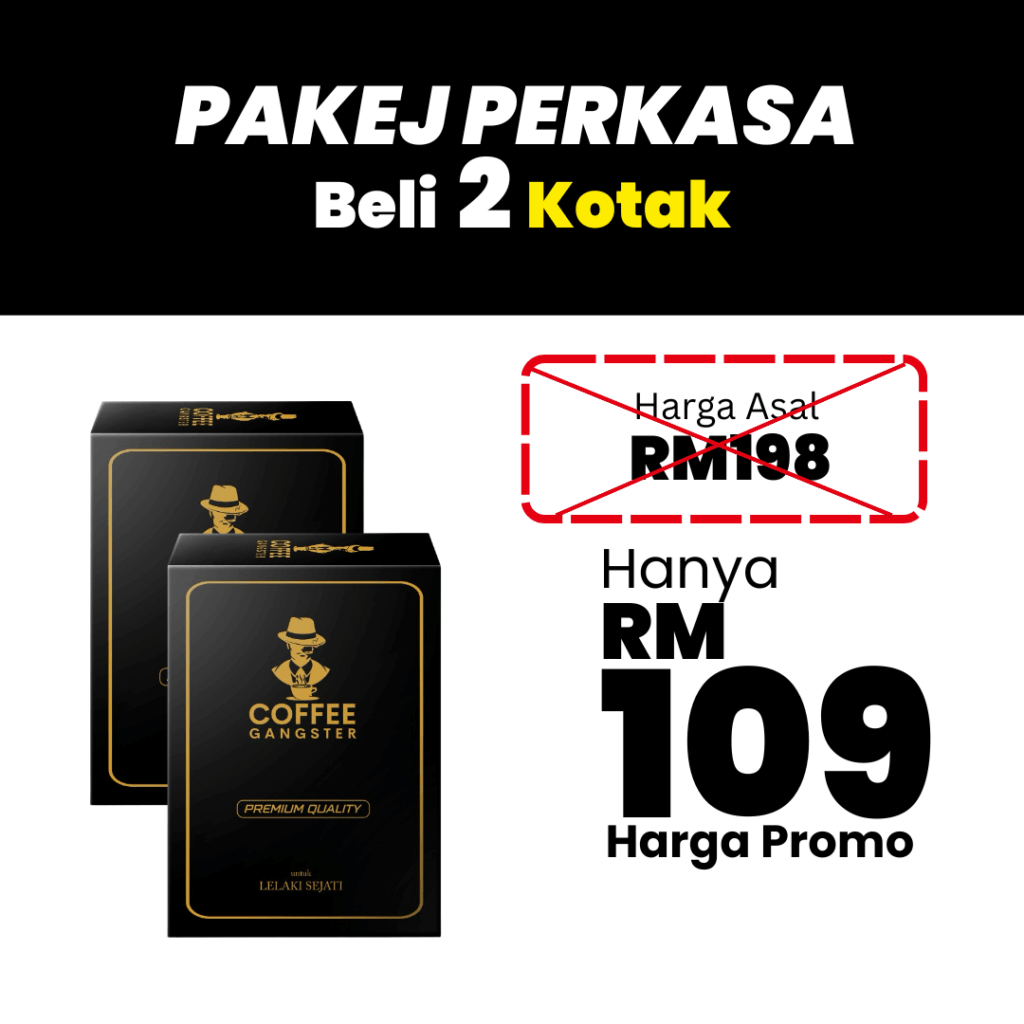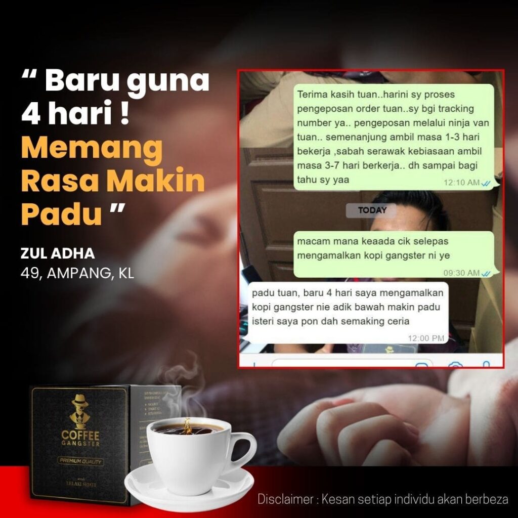 Jika Coffee Gangster tak berjaya puaskan isteri anda, kami akan refund duit anda 2X GANDA. Ini kerana kami yakin produk ini sangat berkualiti tinggi dan terbukti berkesan.