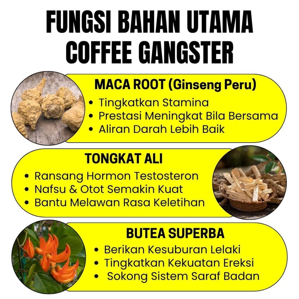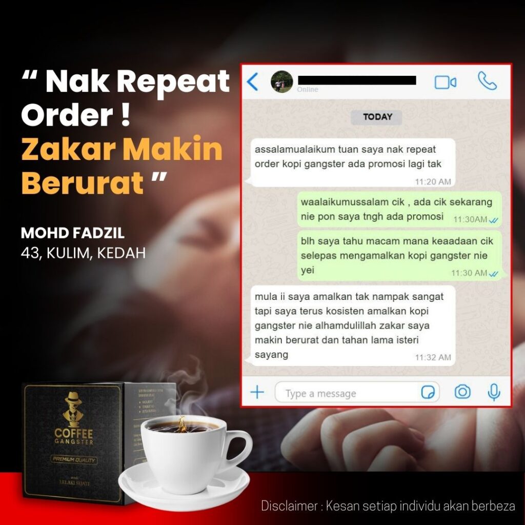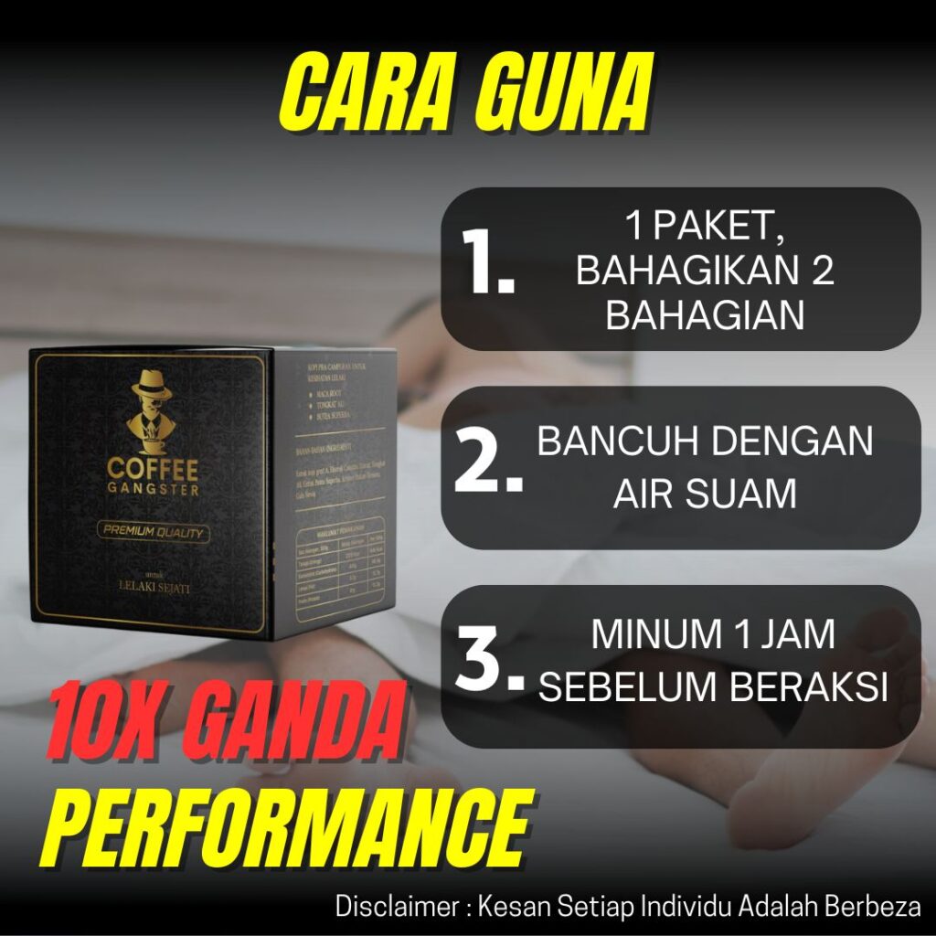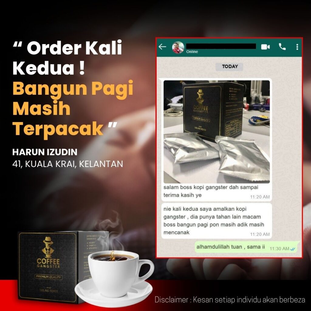 Jika Coffee Gangster tak berjaya puaskan isteri anda, kami akan refund duit anda 2X GANDA. Ini kerana kami yakin produk ini sangat berkualiti tinggi dan terbukti berkesan.