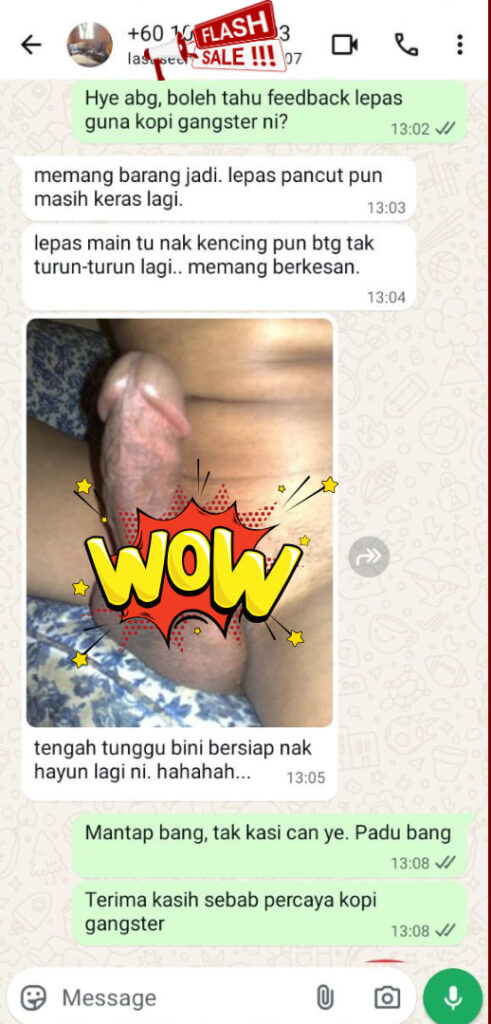Overall feedback yang kami terima, kesan boleh rasa serta merta seawal 30-60 minit selepas minum. Fasa pertama zakar akan keras terpacak, Fasa kedua urat zakar semakin menimbul dan fasa ketiga nafsu seks semakin membuak.